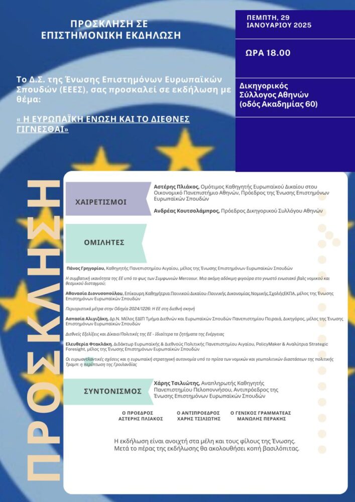 Η Ένωση Επιστημόνων Ευρωπαϊκών Σπουδών (ΕΕΕΣ) σας προσκαλεί την Πέμπτη 29 Ιανουαρίου 2026 και ώρα 18:00 στον Δικηγορικό Σύλλογο Αθηνών (Ακαδημίας 60), όπου θα λάβει χώρα η επιστημονική εκδήλωση με θέμα «Η Ευρωπαϊκή Ένωση και το διεθνές γίγνεσθαι».